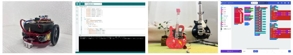 毎年大人気の「micro:bit ゲームプログラミングコース」に加え、今年は新たに2つのコース、と「電子工作 ギターコース」と「電子工作 ミニカーコース」と「AIペットコース」をご用意しています。