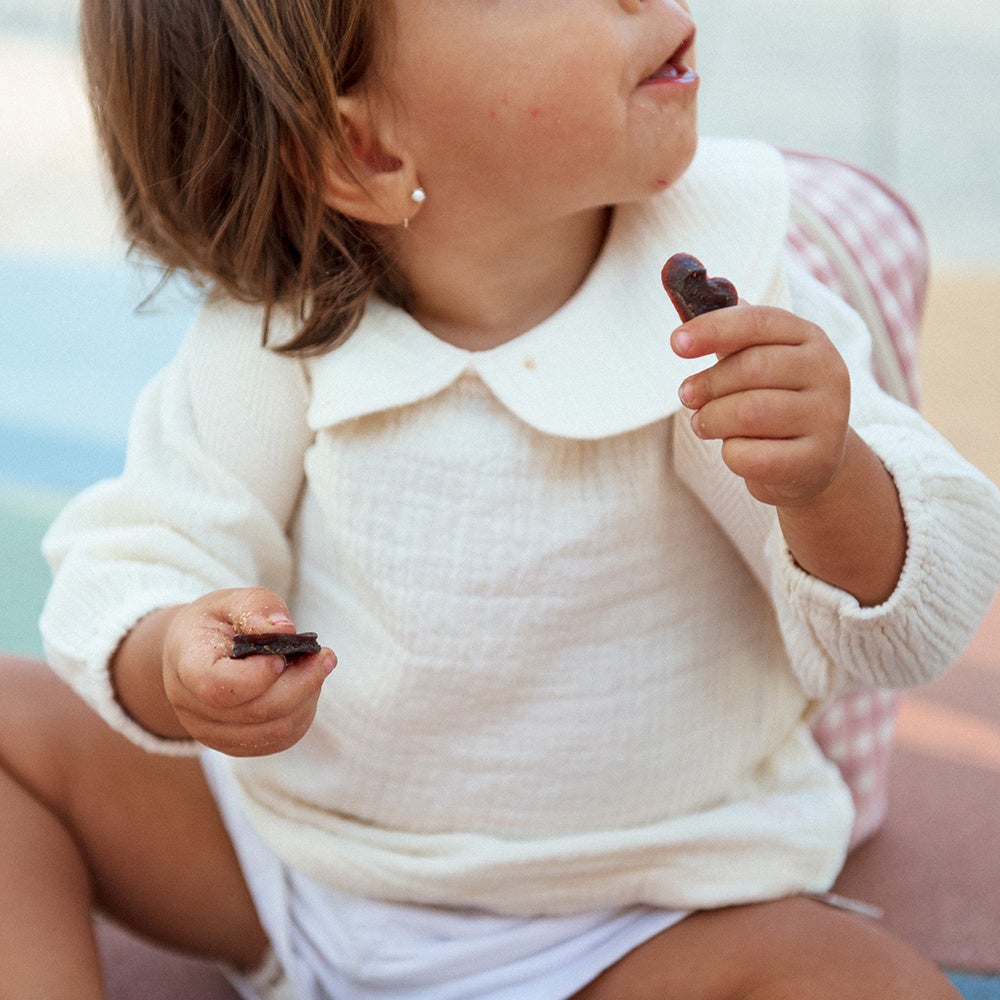 温暖なスペインの大地で育った有機フルーツを低温で長時間加熱する独自の製法でじっくりと固めたお菓子です。砂糖やゼラチン、添加物などを一切加えず作られているので、フルーツそのままの栄養と甘みがあり、優しく噛み応えのあるフルーツスナックが出来上がりました。