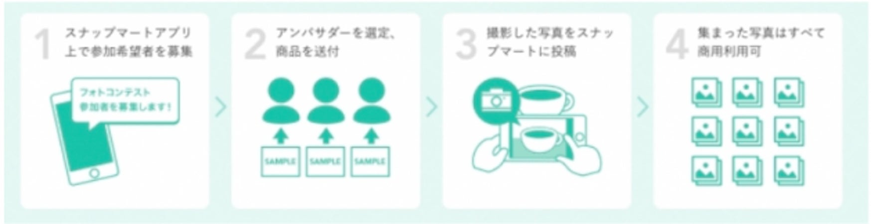 アンバサダープランはコンテスト形式で開催され、企業は賞金と、撮影してほしい商品サンプルを用意。アンバサダーから納品された写真はすべて自社で商用利用が可能です。
