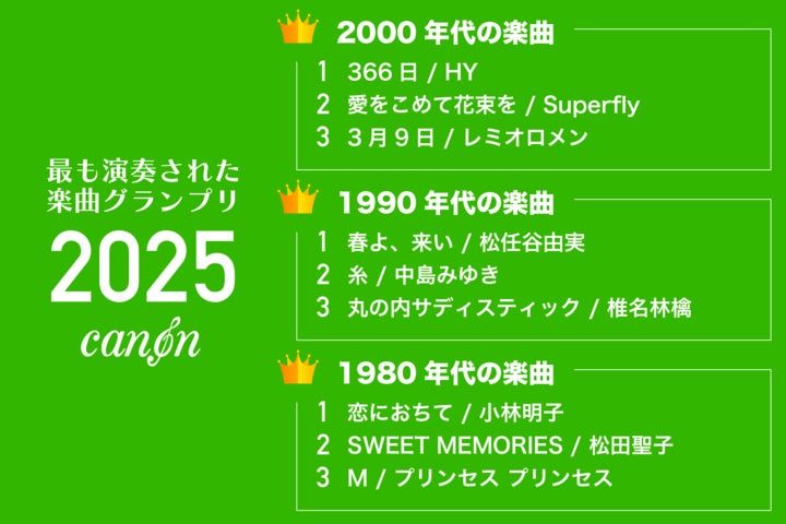 最も演奏された楽曲グランプリ2025:https://www.canon-score.com/annual_ranking/2025