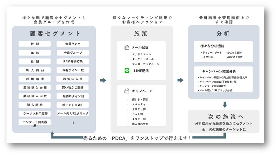 嗜好性の高いコンタクトレンズを取り扱うため、初回購入・2回目購入・リピートに対する施策設計が重要です。メルカートでは、豊富な分析機能でサイト利用者の解像度を上げることができ、行動・購買履歴・嗜好性に応じた細かなセグメンテーションが可能です。また、ノベルティやよりどり割など購買を後押しする販売施策、それらを最適なタイミングでオファーするメールマーケティングアクションが簡単に実現でき、嗜好性やロイヤルティに応じた最適なCRMが可能です。加えてカスタマーサクセスやマーケティング支援など、成長ステージに合わせたワンストップサポートが提供できるため、メルカートを採用いただきました。