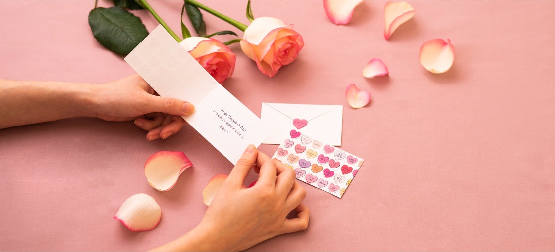 オリジナルデザインのメッセージカードは、ロマンチックなバレンタインデーにぴったりなハートラムネをモチーフとした、ポップでかわいいビンテージ風のデザインに。ハートの部分にはエンボス加工を施しており、模様が浮き出る特別感のある作りです。さらに裏面はラブレター風のデザインとなっており、「valentine's day」の文字入り。オリジナルデザインと二つ折りの仕様で、ラブレターを開く時のようなワクワク感をお届けします。