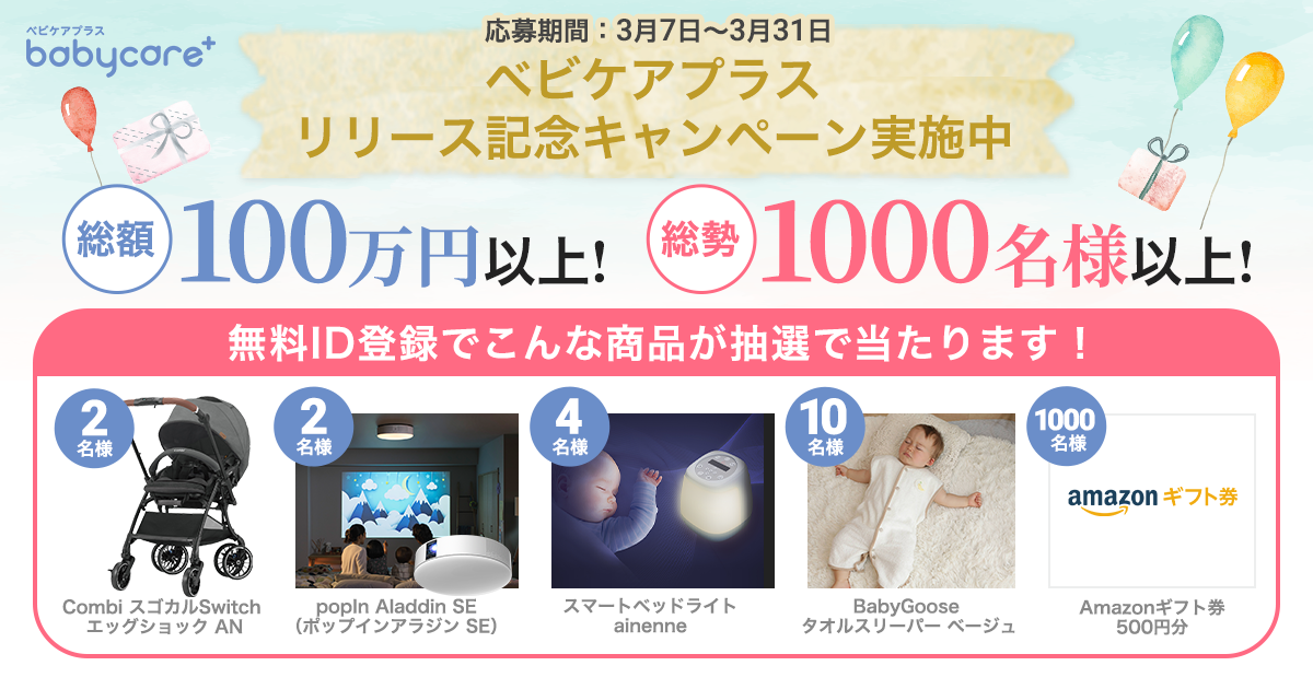 - ベビケアプラスリリース記念キャンペーンを実施。3月31日までに無料会員ID登録すると、総額100万円・総勢1000名に当たるプレゼントキャンペーンに自動的に応募できます