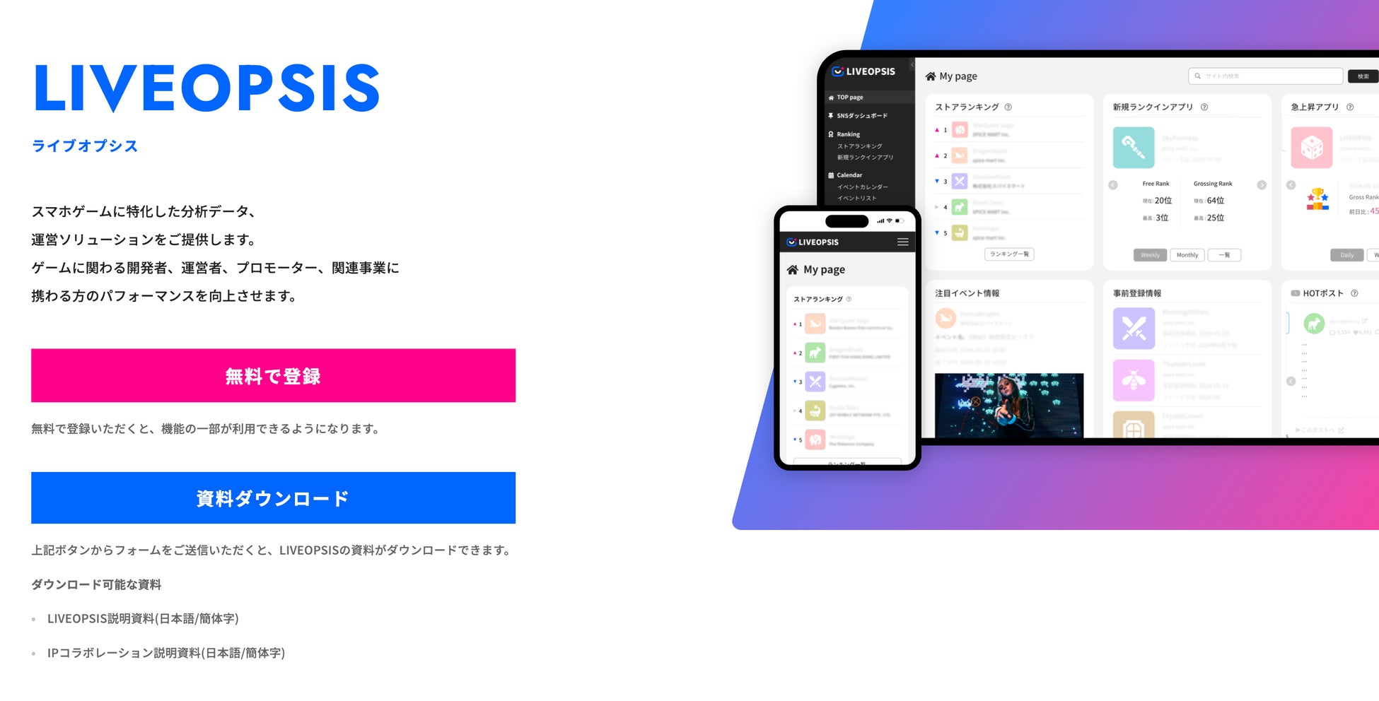 ・スマホゲーム特化の分析データ・運営ソリューション「LIVEOPSIS (ライブオプシス)」運営