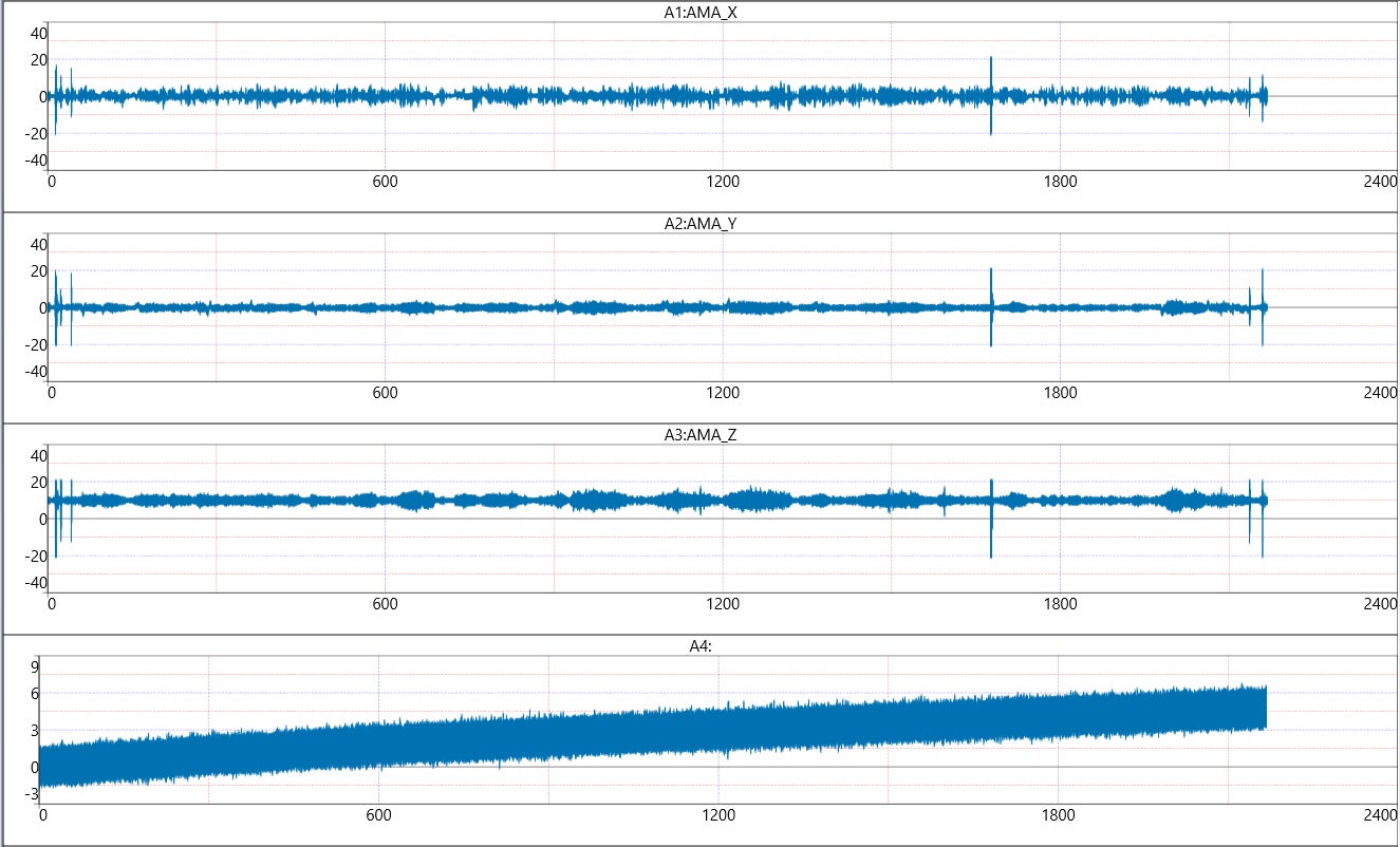 同期運転や繰り返し集録などで出力された関連ファイルをまとめて読み込む機能「スイート読み」を使う事で、異なるファイルの同一チャネルを時系列順に配置したチャネルを生成します。ファイルを都度結合する必要がないため、測定結果をスムーズに確認