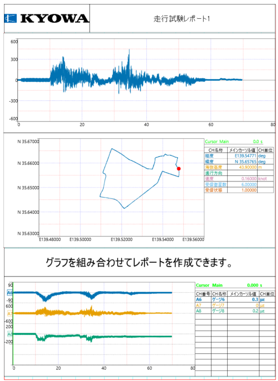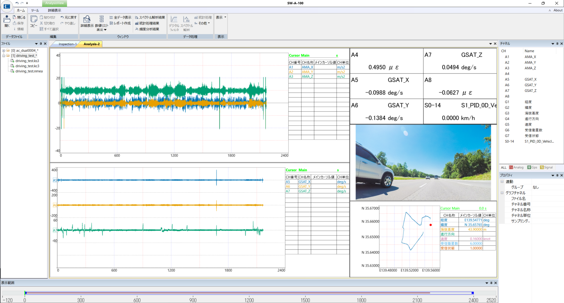 大量の測定データを素早く読み込み、全データの波形を即座にグラフ表示します。また、測定データに加え、動画やGPSデータも表示可能です。