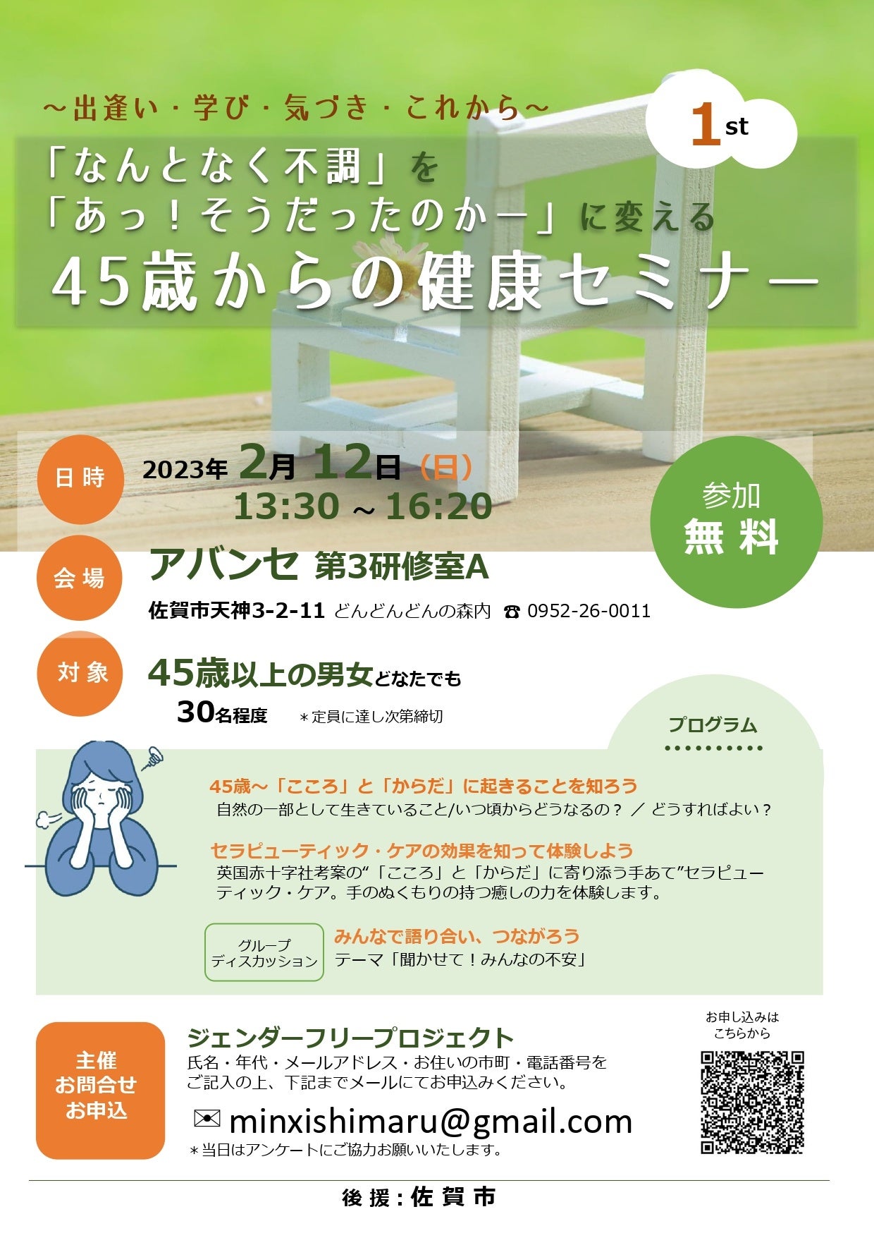 その第1弾として開催するこのセミナーでは、45歳からの「こころ」と「からだ」におこるさまざまな変化や不調について知り、グループディスカッションを通して語り合い、つながります。