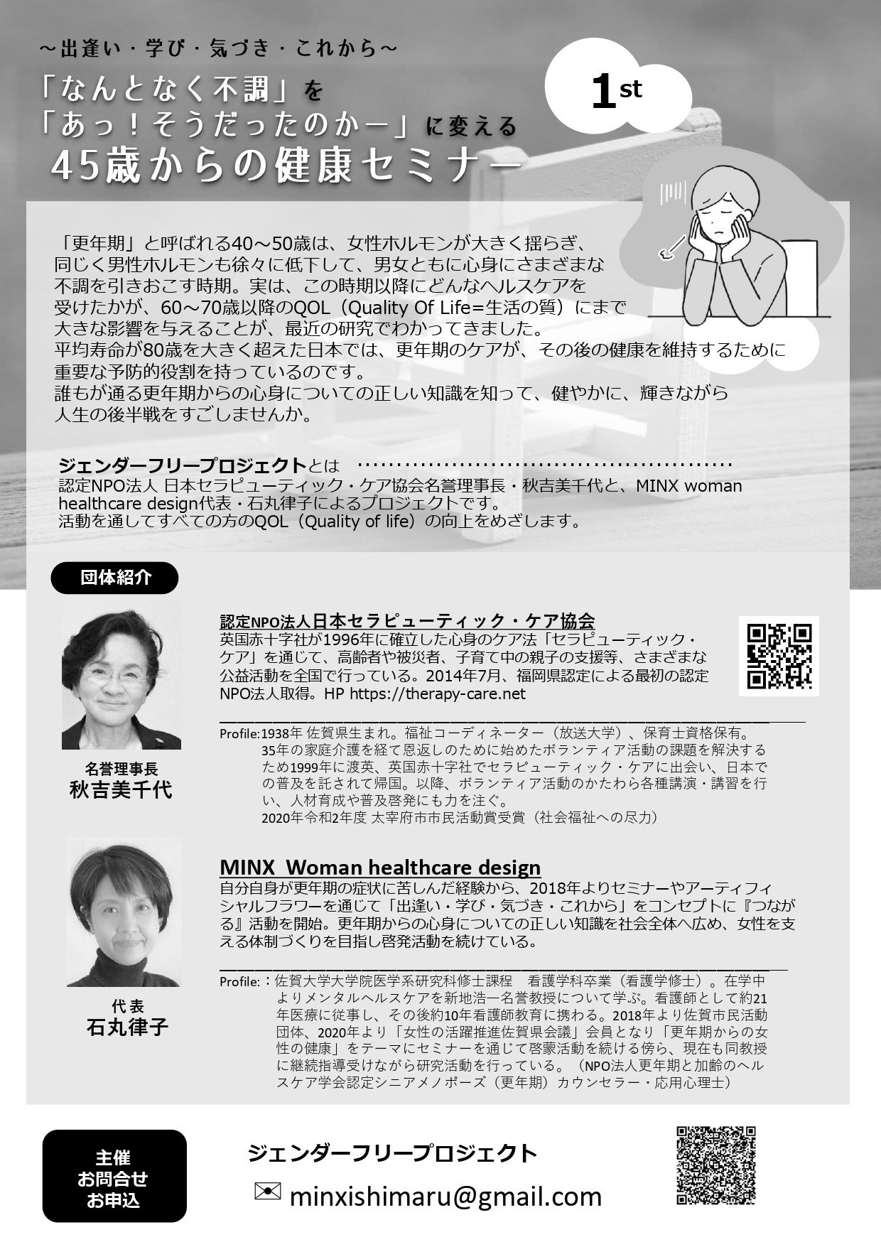 主催は、認定NPO法人 日本セラピューティック・ケア協会の名誉理事長、秋吉美千代とMINX woman healthcare design代表の石丸律子がタッグを組み、たちあげた「ジェンダーフリープロジェクト」。