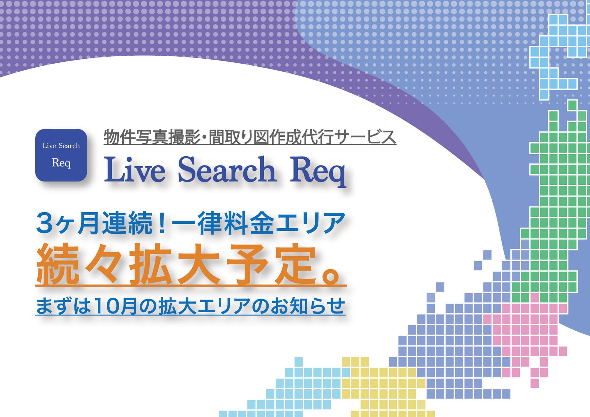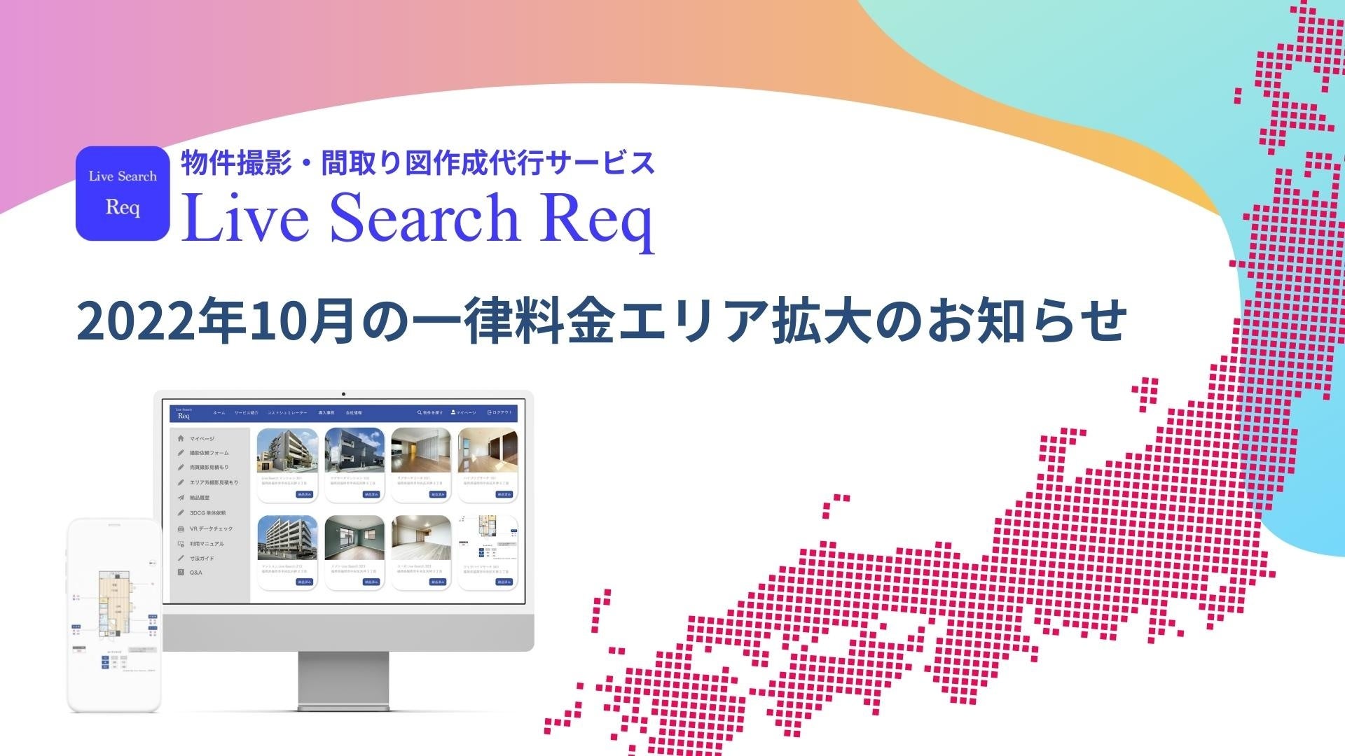 東京・福岡・兵庫の不動産業者様向けに物件撮影・間取り図作成代行サービス「Req(レック)」や物件写真・間取り図をダウンロードできる物件データベース「Stockplace(ストックプレイス)」を展開する株式会社Live Search(福岡県福岡市中央区、代表取締役 福井隆太郎)は、2022年10月より、東京都内のほかに調布市、府中市、狛江市、三鷹市、武蔵野市、西東京市の6つの市を追加エリアとして提供スタートすることをお知らせいたします。