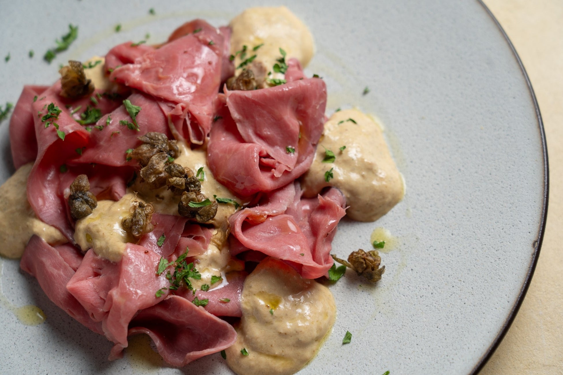 沖縄県うるま市の経産⽜を低温調理でしっとり仕上げ、⾃家製のトンナート(ツナ)ソースを添えました。素揚げしたケッパーもいいアクセント。イタリアピエモンテの伝統料理です。