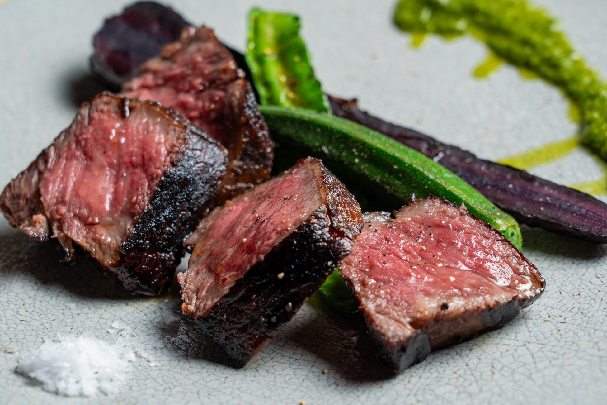 沖縄県うるま市の経産⽜を備⻑炭で外はカリッと中はジューシーに焼き上げた、あやはし⽜の旨味をしっかり感じられる⼀品。お好みでサルサヴェルデを付けても美味しいです。