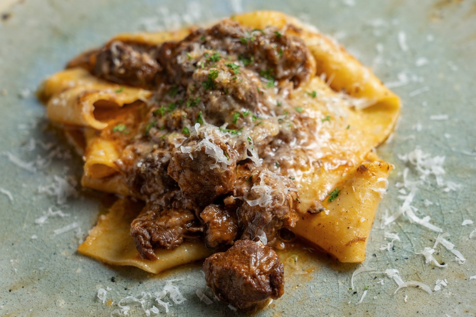 あぐーは腕やすね⾁をたっぷりの⾚ワインで丁寧にじっくり煮込み、シェフ⾃慢のラグーに⼿打ちのパッパルデッレを絡めた⼀品。