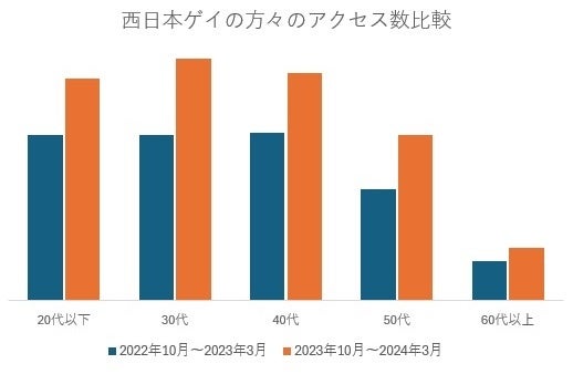 上記のアクセス数を2022年10月~2023年3月と2023年10月~2024年3月を比べると20代以下~60代以上のすべての年代で増加しています。