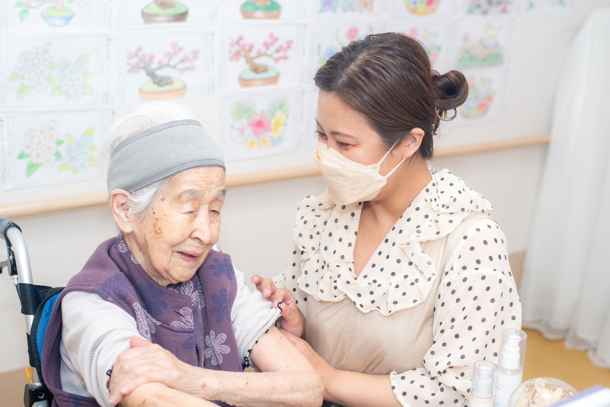 尾久のはらっぱでは、介護美容研究所を卒業した「ケアビューティスト」が職員として在籍しており、毎月22日に「はらっぱBEAUTY」を開催し、入居者・利用者の方に介護美容を提供しています。