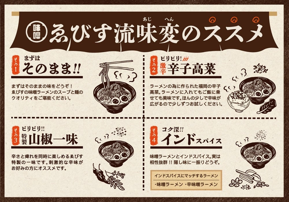 ラーメンゑびすでは、充実した卓上調味料をご用意。福岡の辛子高菜でラーメンをピリピリに辛く、山椒でビリビリしびれる刺激を味わったり、インドスパイスで香りとコクを味わったり、最後の一滴まで自分好みにラーメンをカスタマイズできる楽しさもゑびすならではの魅力です。