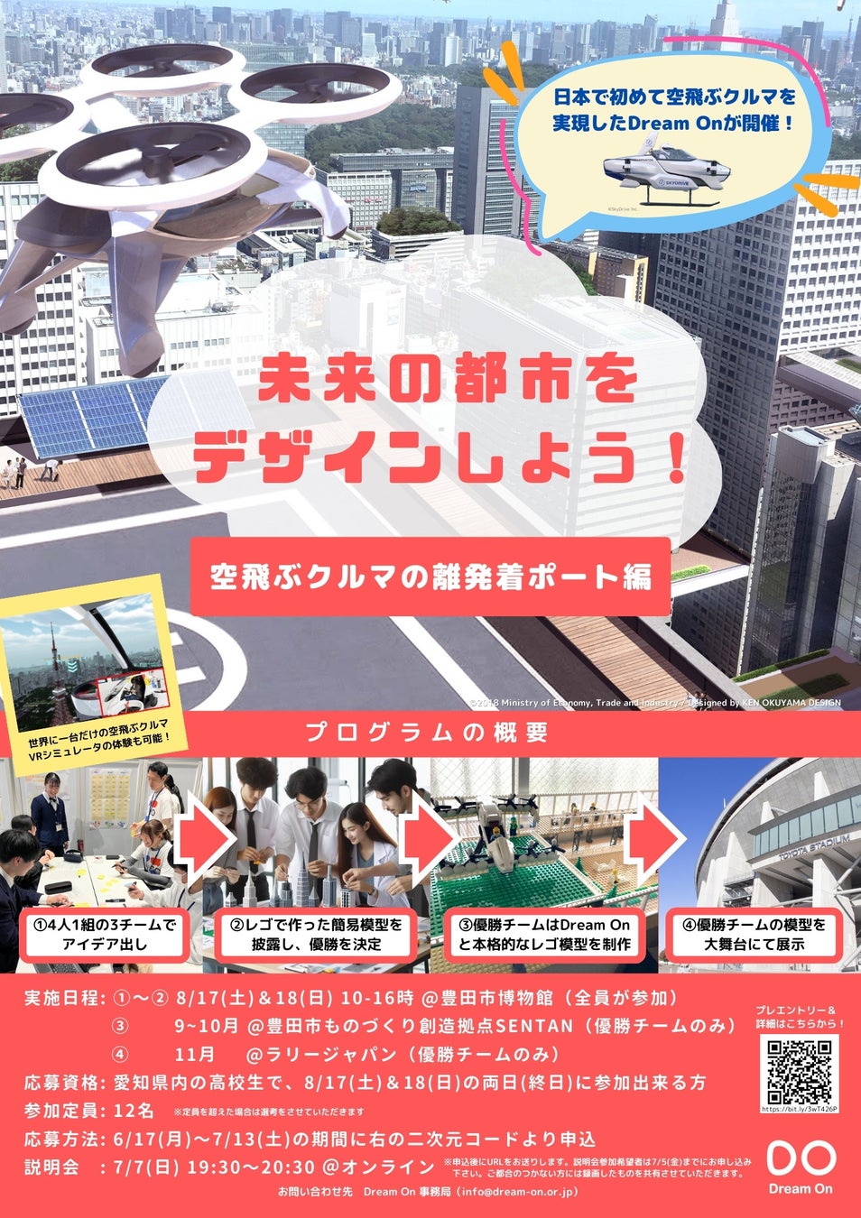 11月21日〜24日にFIA世界ラリー選手権(WRC)フォーラムエイト・ラリージャパン2024が行われる豊田スタジアムにて、高校生が創造した「2040年の空飛ぶクルマのある街」の模型(以下 本模型)を展示します。この展示は、有志団体Dream On(代表:中村 翼、以下 Dream On)が、2024年8〜11月に愛知県で行った次世代イノベーター育成プログラム「FLEX Park」の一環として実施するものです。なお本模型は、同イベントの「株式会社SkyDrive / 有志団体Dream On」出展ブースにて、株式会社 SkyDrive(以下 SkyDrive)の空飛ぶクルマSD-03展示機、およびDream Onの空飛ぶクルマVRシミュレーターと並んで展示されます。