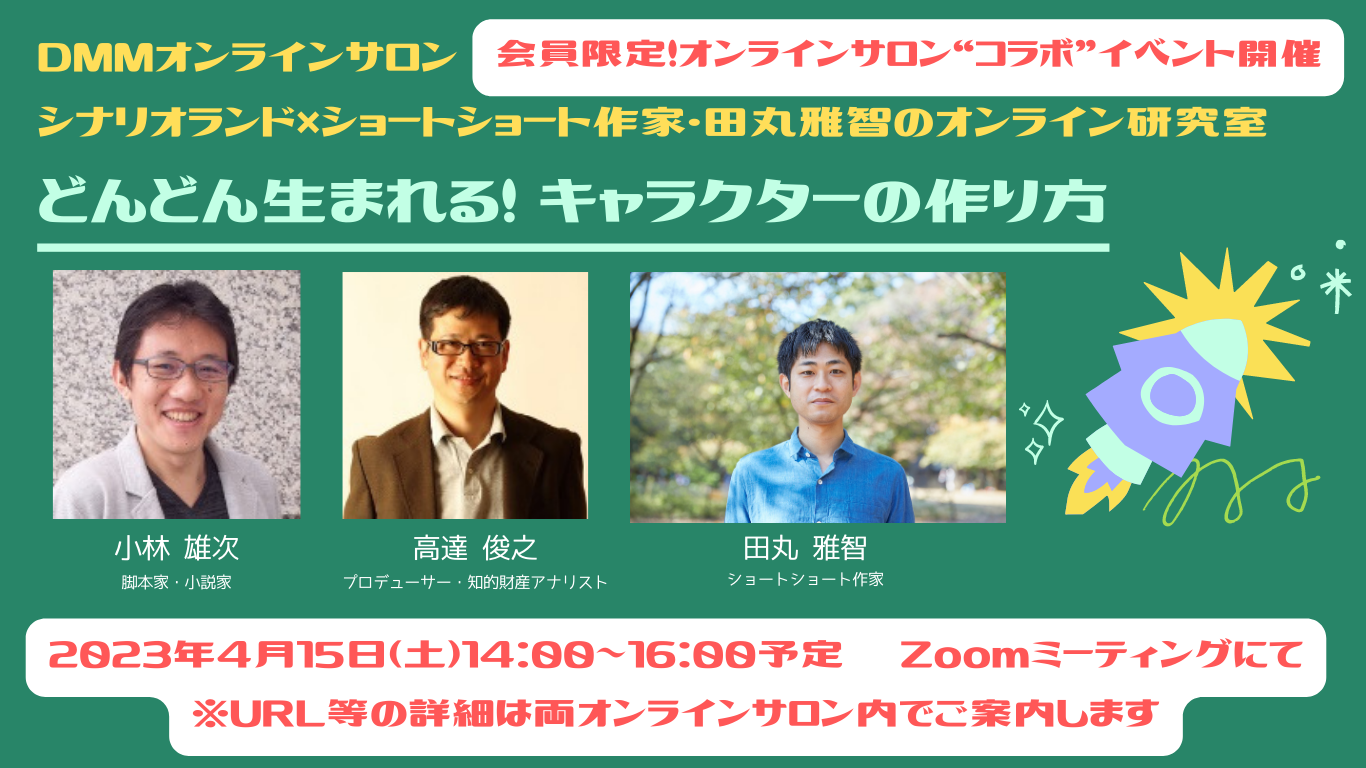 - 4月15日(土)「シナリオランド×ショートショート作家・田丸雅智のオンライン研究室 ~どんどん生まれる! キャラクターの作り方~」開催!