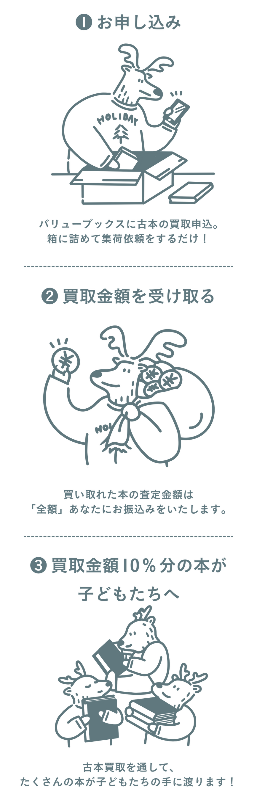 古本の買取申し込みで応募完了。買取金額10%分の本を子どもたちへプレゼント。