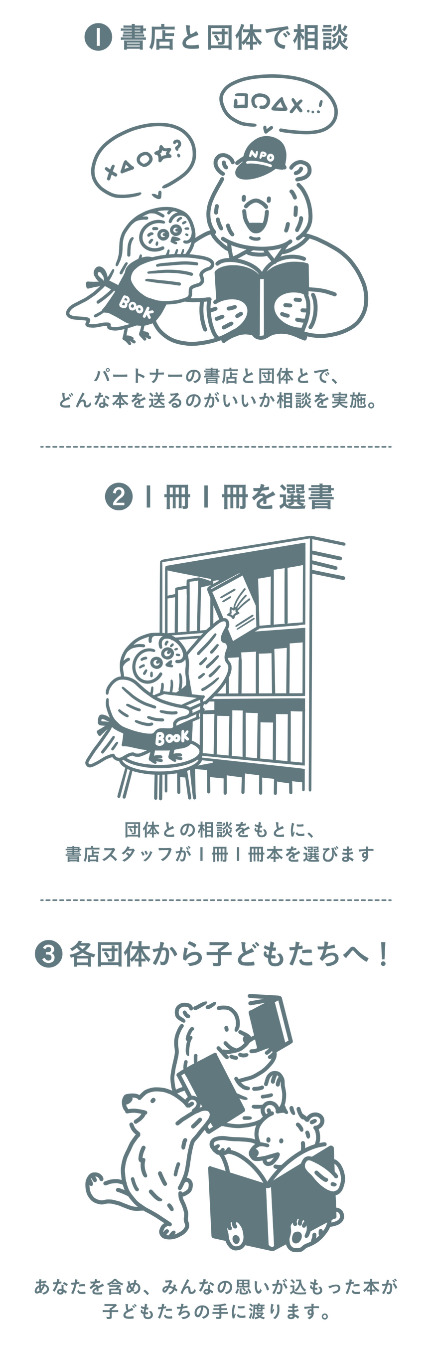 子どもたちが無償で本を読める機会を提携するさまざまな団体、本の調達を行う書店、プロジェクトに賛同し本を送ってくださった方々と共につくりたいと考えています。
