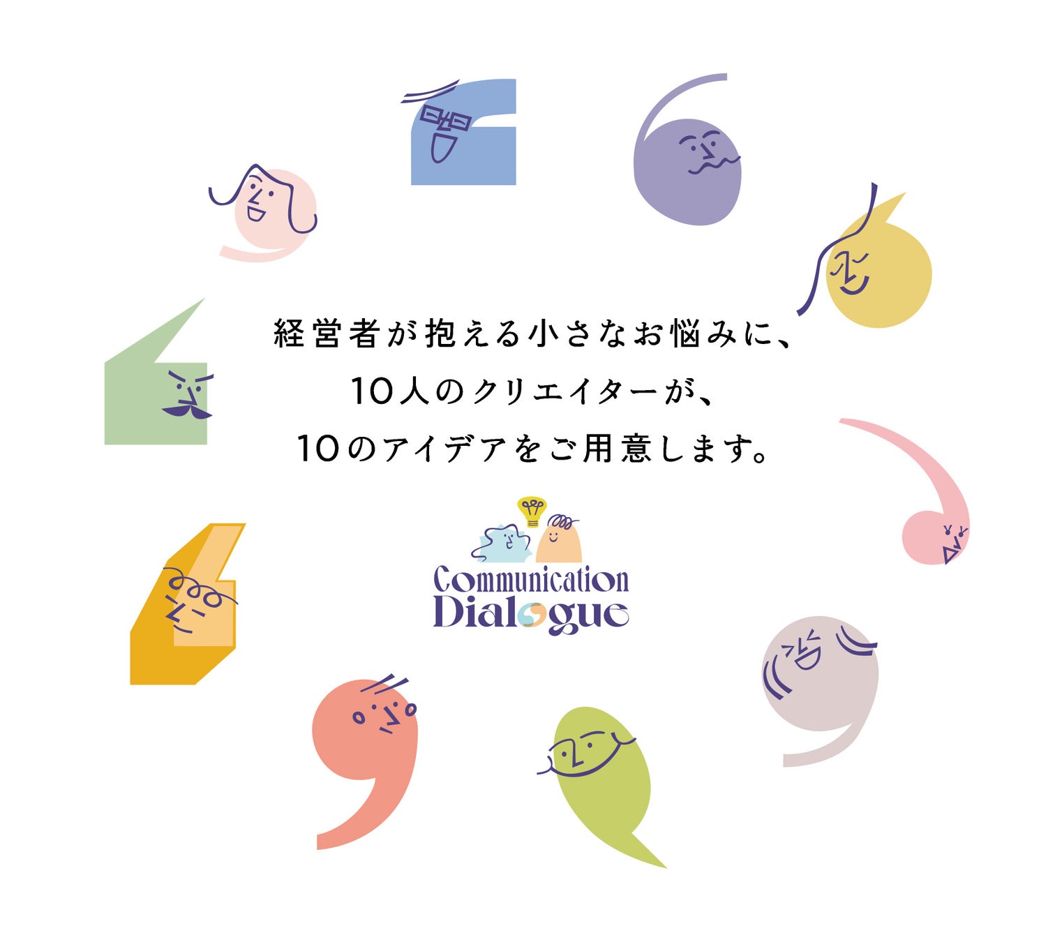 「コミュニケーション・ダイアローグ」は、経営者・マネージャー層の皆さまから“小さな悩み”をヒアリングし、それに対して10人のクリエイターが10のジャストアイデアを提供するコンサルティング・サービスです。提供されるアイデアは荒削りかもしれませんが、自分たちではたどり着けなかった意外性や突破口が見つかることも。コピーライター、アートディレクター、アクティベーションプランナーなど、異なる職能を持つクリエイターそれぞれの本質を見極める視点と、型にとらわれない発想で、経営者・マネージャー層の皆さまに新たな気づきをもたらします。