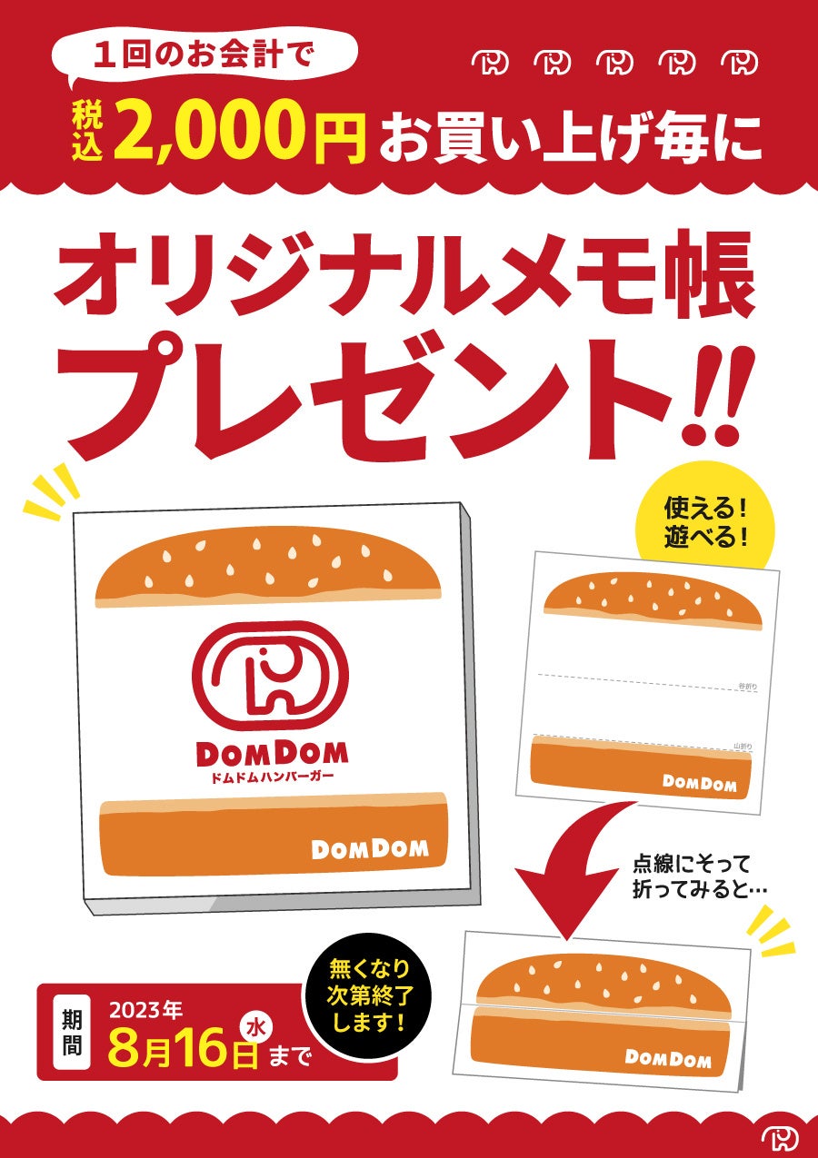 ●ドムドムハンバーガー イオン赤羽北本通り店にて、一会計で2,000円(税込)以上お買い上げのお客様に、オリジナルメモ帳を先着でプレゼントいたします。