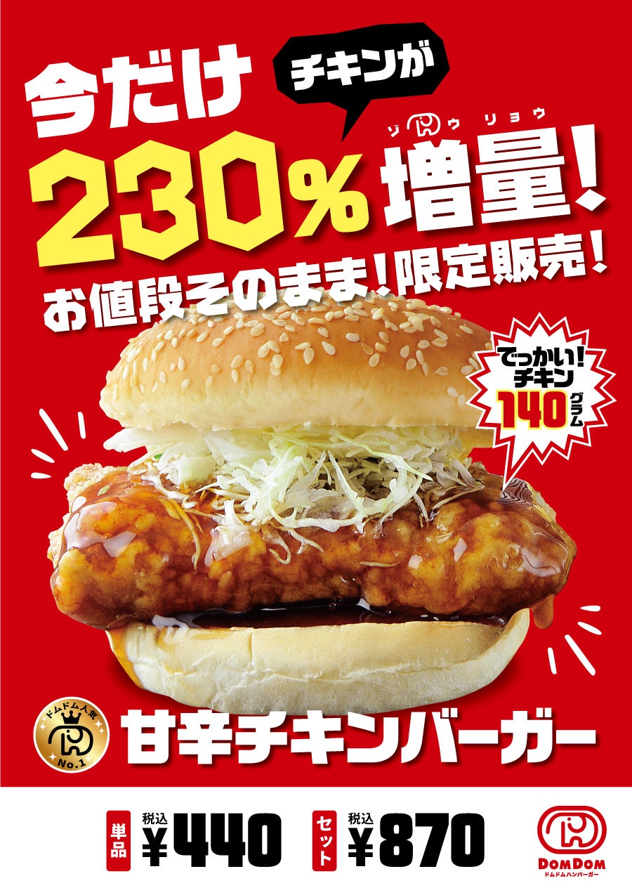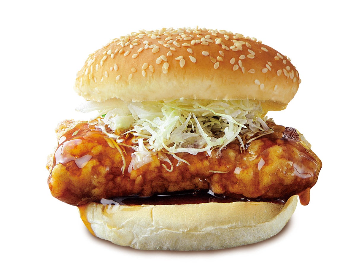 ●1番人気「甘辛チキンバーガー」のチキンが、2.3倍のボリュームで登場。