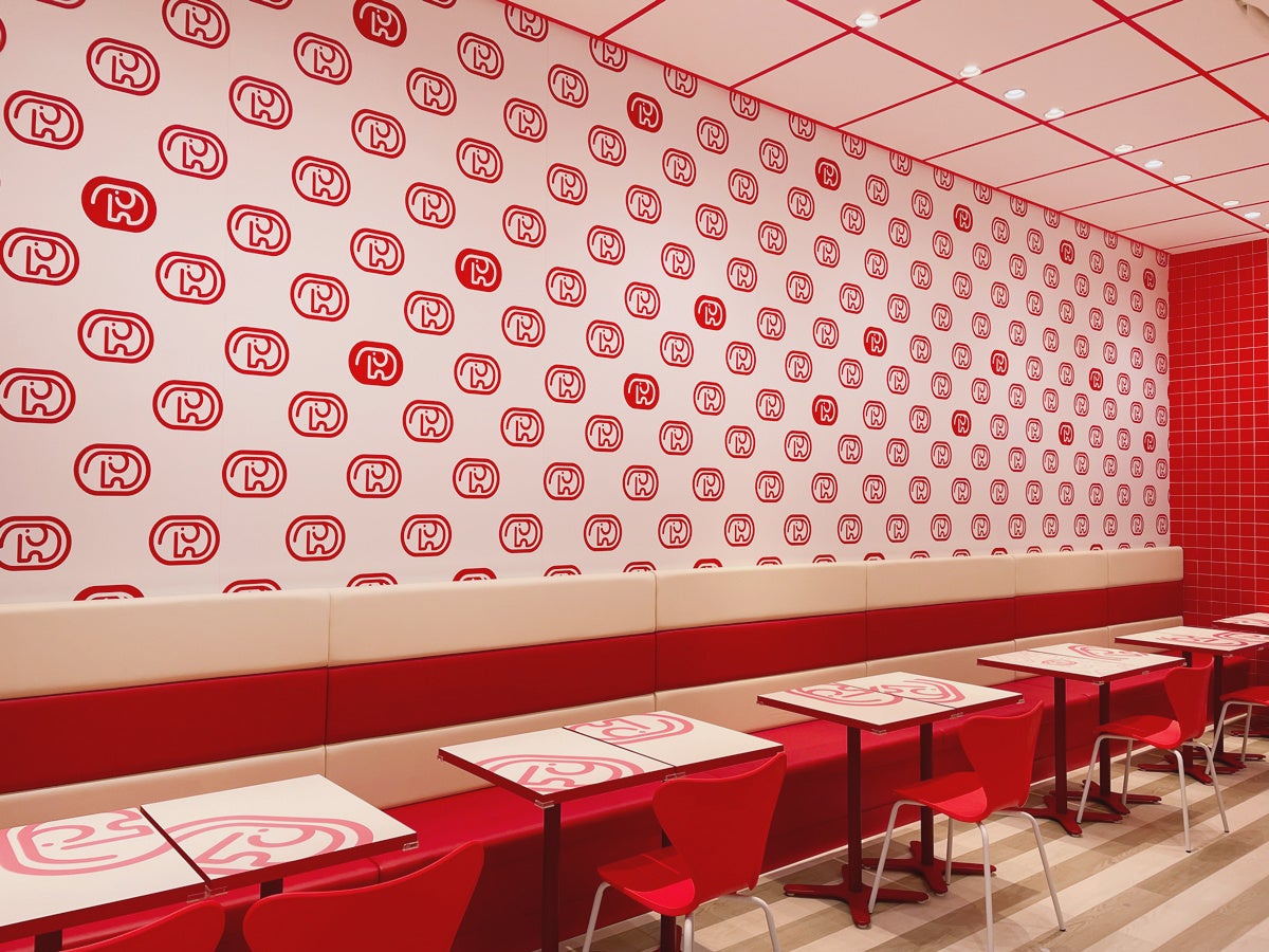 店舗の特徴として、内外観は赤と白を基調としたカジュアルで気分が高揚するようなポップなデザイン、お食事だけでなく人気のグッズもお買い求めいただけます。