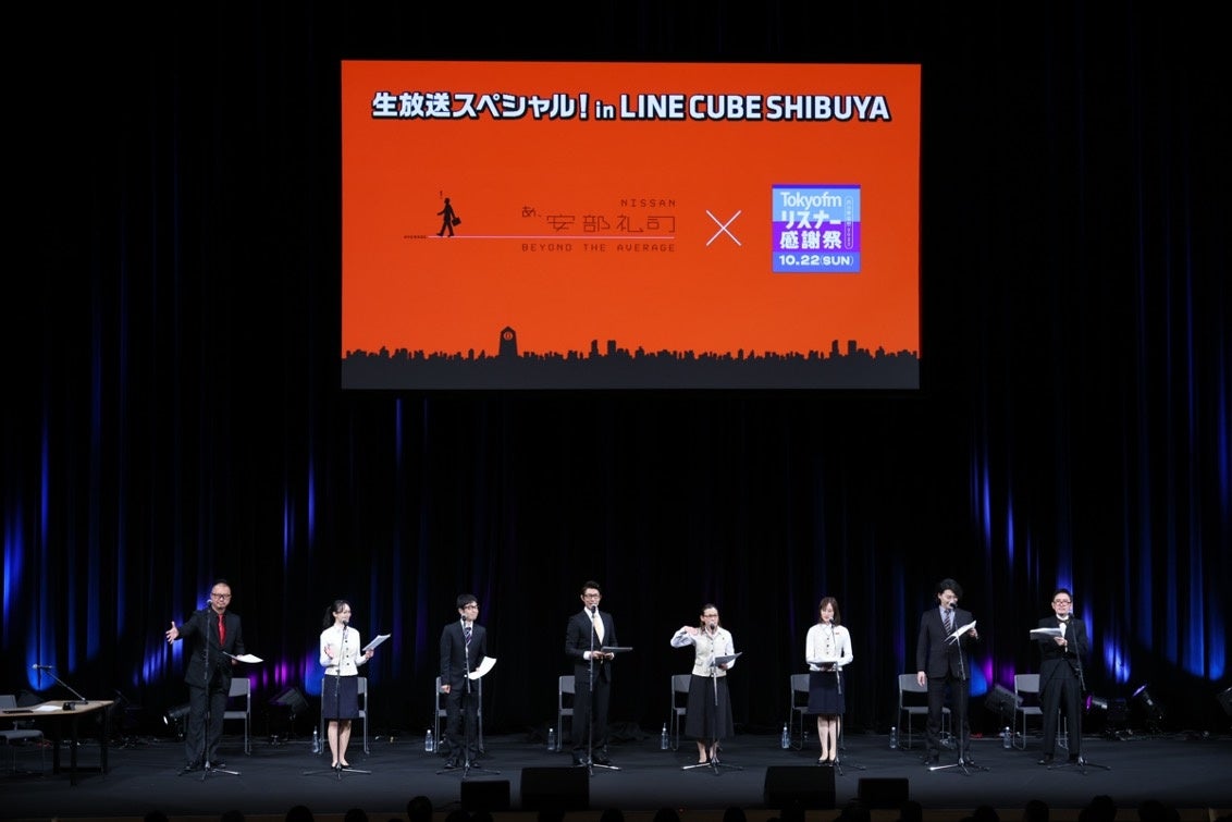 2部はごく平均的なサラリーマン「安部礼司」が、社会の荒波に揉まれながら成長していく様子を描いたラジオドラマ「NISSAN あ、安部礼司~BEYOND THE AVERAGE~」(毎週日曜17:00〜17:55放送)の公開生放送。約15年前、主人公・安部礼司と優が結婚式を挙げた地がこのLINE CUBE SHIBUYAとなり、縁あるこの地でイベントを実施しました。また平日人気ワイド番組パーソナリティが集結した「ワイド番組パーソナリティ大集合スペシャル!」の生放送、またトークイベントを行いました。