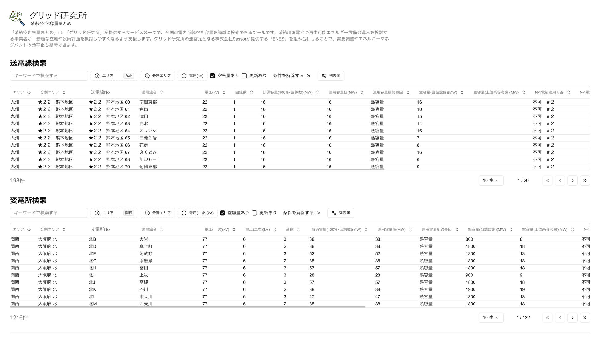 株式会社Sassor(本社:東京都目黒区、代表取締役:石橋 秀一、以下「Sassor」)は、当社が運営する情報サイト「グリッド研究所」において提供している電力系統の空き容量情報検索サービス「系統空き容量まとめ」について、対応エリアを全国に拡大しました。これまで東京エリアのみを対象としていましたが、今回の拡充により、北海道・東北・中部・北陸・関西・中国・四国・九州を含む全国9エリアの空き容量をまとめて確認できます。さらに、前回更新時からの空き容量の差分表示機能も新たに追加し、系統用蓄電池や再生可能エネルギー設備の導入検討に役立つ、タイムリーな情報取得が可能となりました。