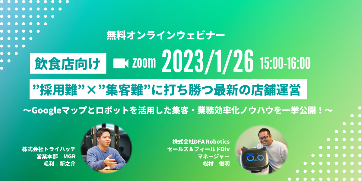 【2023年1月26日(木)15:00〜16:00】DFA Robotics × トライハッチ共催!「飲食店向け”採用難”×”集客難”脱却」~Googleマップ×配膳ロボットを活用した店舗販促術~