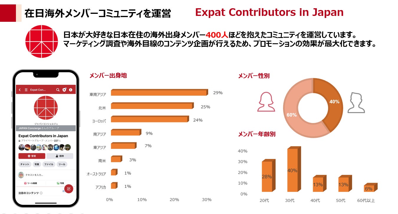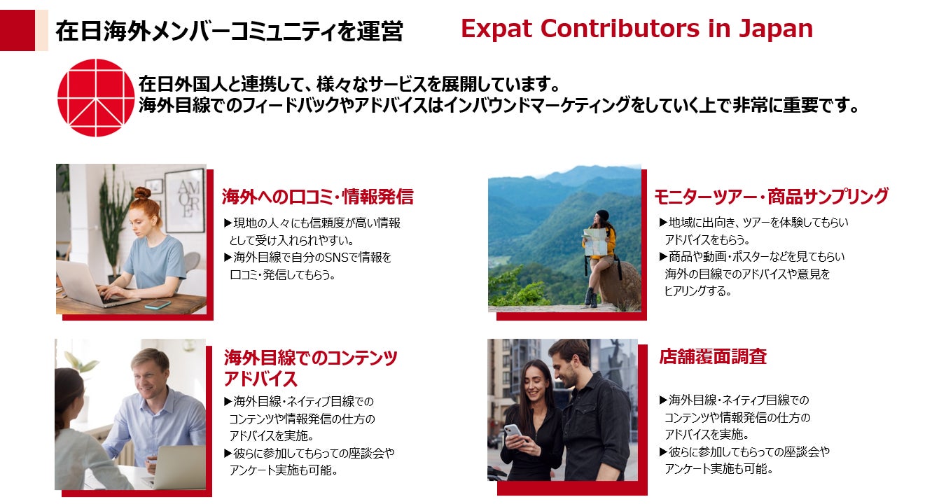 覆面調査にあたるのは、当社が運営する「ECJ」(Expat Contributors in Japan)※1という在日外国人によるコミュニティに所属される人たちで、みなさん全員、海外出身で日本が大好きな日本在住の方々で、母国にフォロワーを持つインフルエンサーやライター、カメラマンなど、様々な会員の方が現在400人ほどが参加されています。