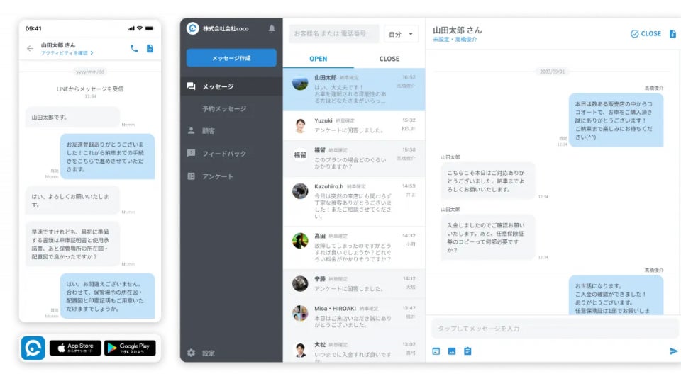 メッセージ一元管理サービス「coco」は、ホンダカーズ前橋様、ウイルプラスホールディングス様、サコダ車輌様、大谷自動車様、ナオイオート様、太陽自動車様、古城モータース様等、日本全国の自動車販売店にてご利用いただいております。