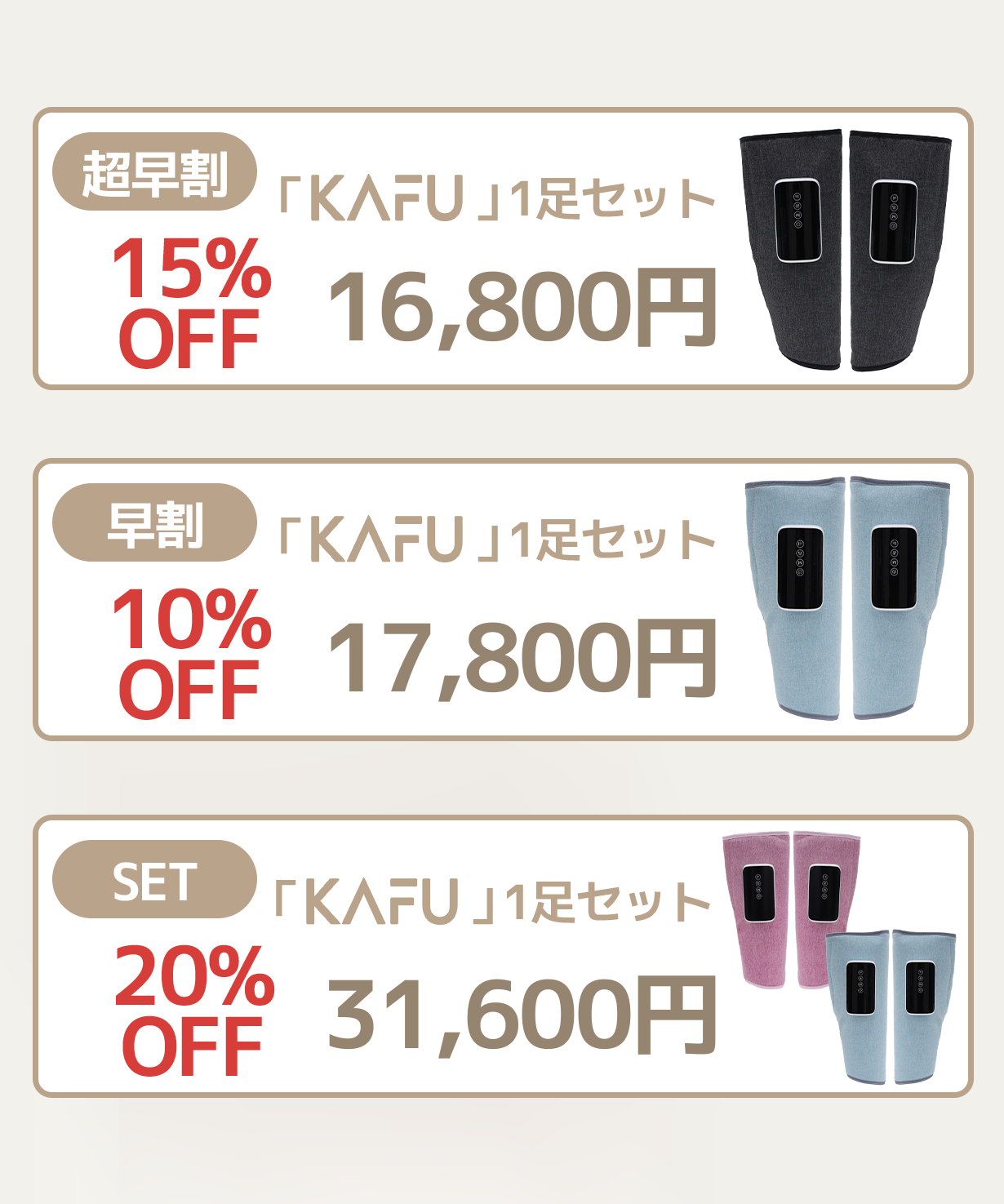 | 価格 | 【超早割15%オフ先着100名】コードレスケア機「KAFU」一足セット 16,800円(税込) 【早割 15%OFF 先着200名】コードレスケア機「KAFU」一足セット17,800円(税込) 《2個セット》【早割 20%OFF 先着50名】31,000円(税込) |