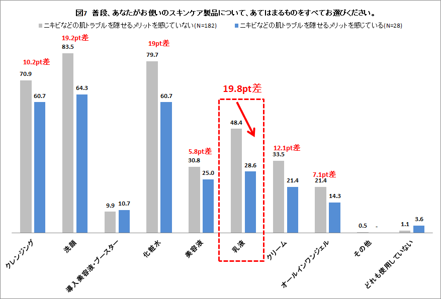 肌悩みがあり、「肌トラブルを隠せる」マスクメリットを感じている人と感じていない人の、普段使用しているスキンケア製品を比べると、「肌トラブルを隠せる」マスクメリットを感じている人のほうがスキンケア製品の使用率が全体的に低いことが分かりました。最も差が大きかったのは「乳液」で約20ポイントも低い結果に(図7)。マスクで肌トラブルを隠せることが影響し、スキンケアがおざなりになってしまっているかもしれません。