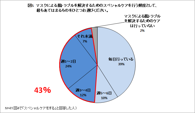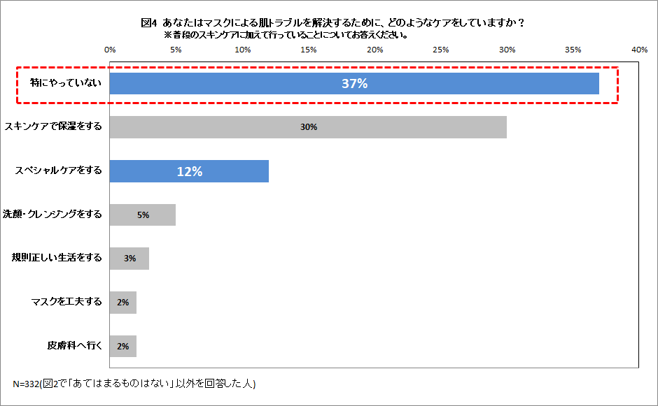 肌悩みがあると回答した人に対して、マスク着用時の肌トラブルを解決するためのケアを尋ねたところ、乾燥などの肌悩みがあるにも関わらず、「特にやっていない」人が約4割もいることが分かりました。(図4)