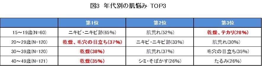 年代別では、20~40代の第1位、10代後半は年齢によるニキビや肌荒れ悩みが強く表れている一方で、第3位に「乾燥」がランクイン。(図3)