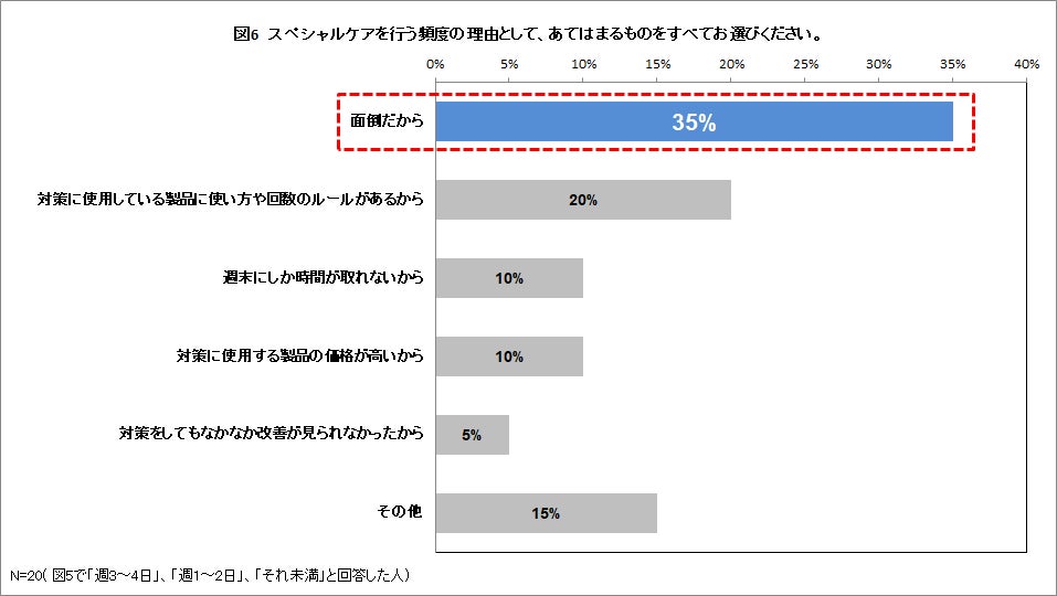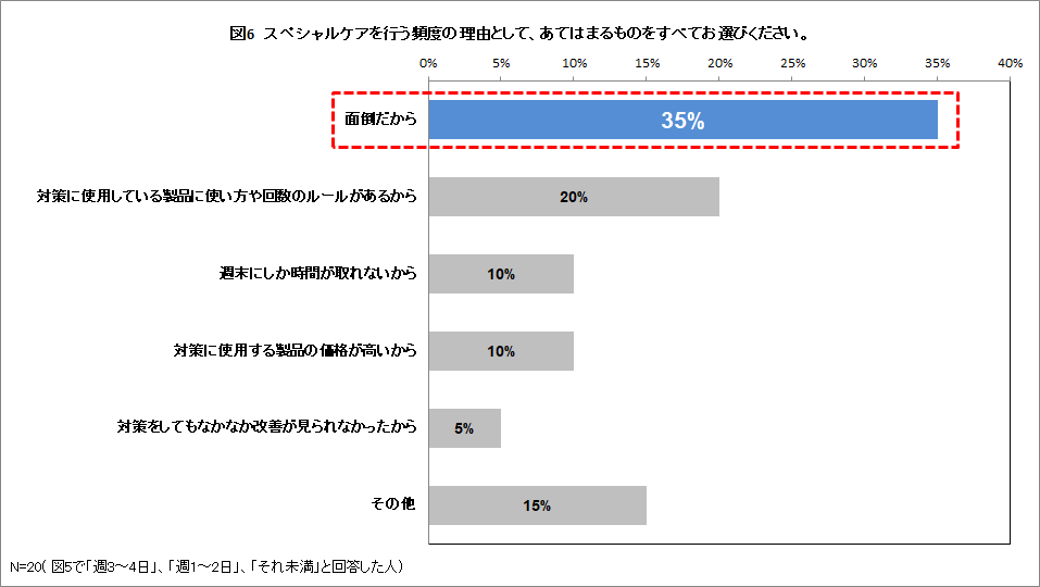 3位の「スペシャルケアをする」(12%)と回答した人は、シートマスクや、ニキビ対策用のポイントケア、マッサージ、美顔器、サプリメントなどを取り入れていましたが、「面倒だから」という理由で、約半数が毎日継続できていないようです。 (図5・6)