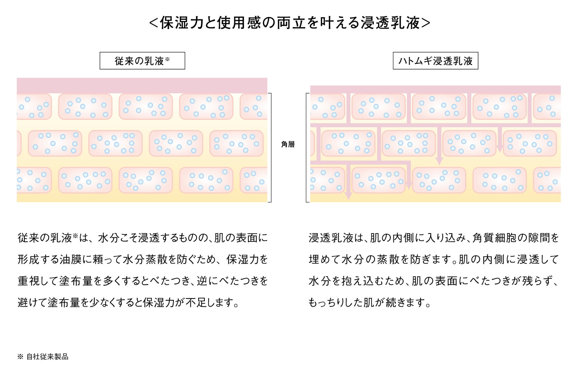 また、ナチュリエ ハトムギスキンケアは、ハトムギ化粧水、ハトムギ保湿ジェルで水分をたっぷりチャージした後、ハトムギ浸透乳液で水分をキープするシンプルケアのため、毎日継続しやすく保湿ケアが叶います。
