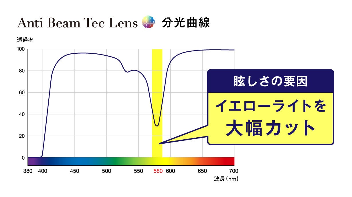 光の波長域の中でもエネルギーが強く「色」としての認識に時間のかかる黄色(585nm付近)の波長を抑制し、色調をコントロールします。
