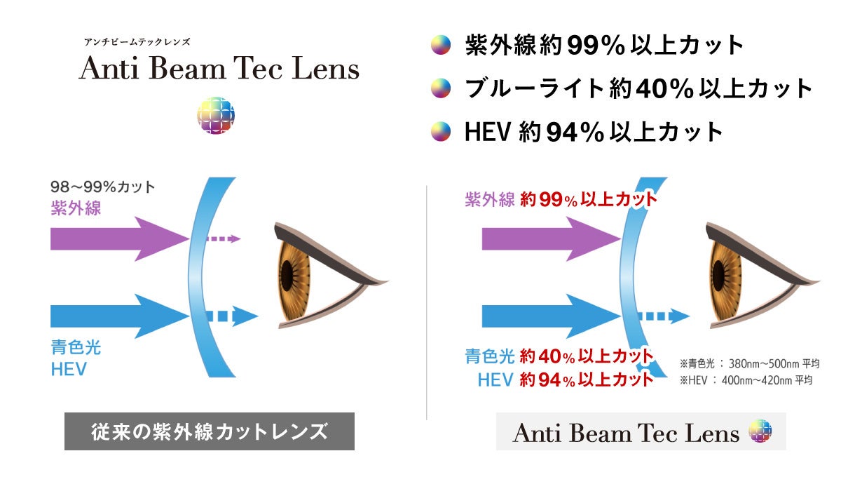 『アンチビームテックレンズ』(https://meganestore.co.jp/anti-beam-tec-lens/)は、眼のトラブルとなる“光を徹底攻略“したメガネストアーオリジナルの新時代レンズです。