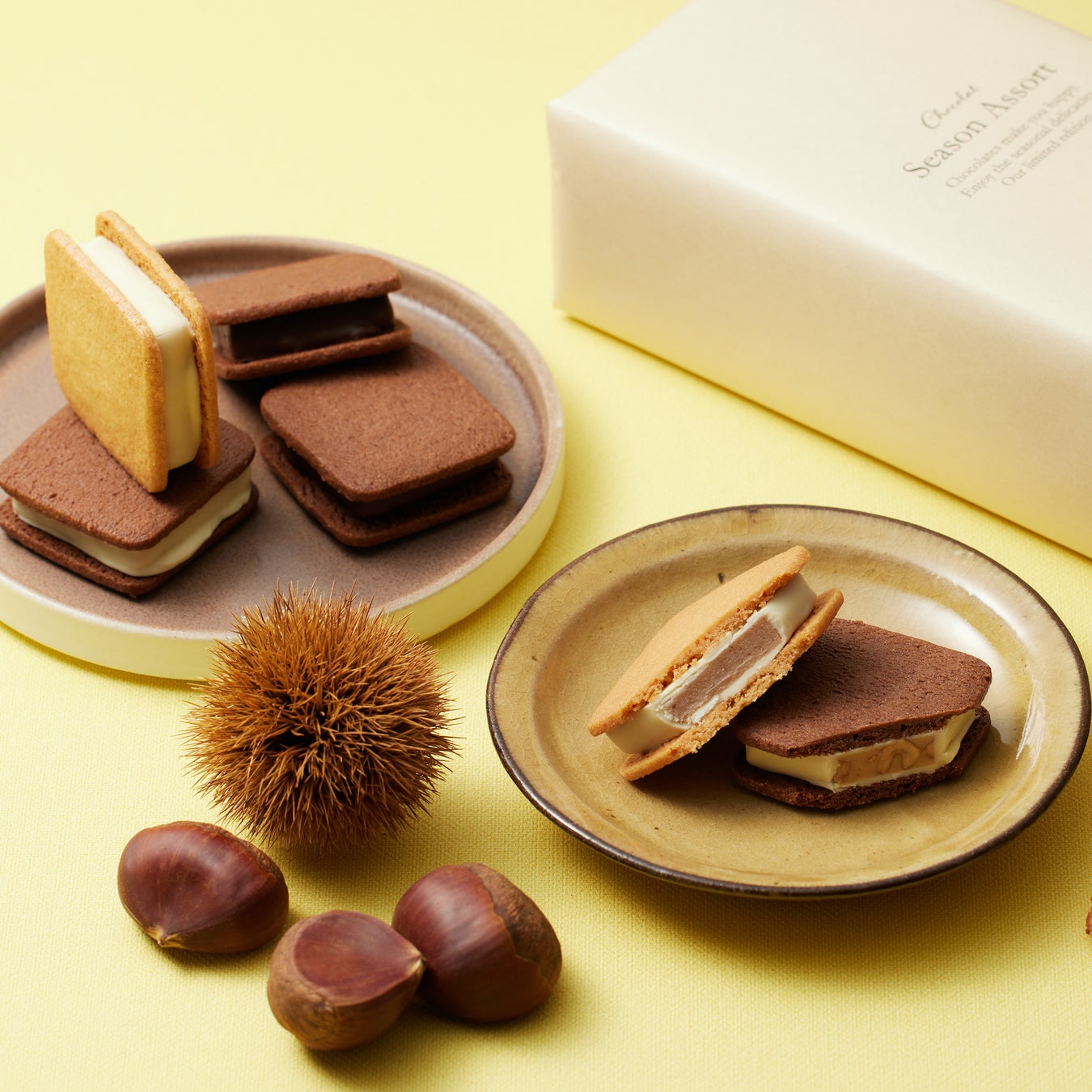 「ショーコラ」とは弊社を代表する、フェアトレードチョコレートを使用した生チョコレートサンドです。今回のアソートは秋を感じられる、栗やナッツを使ったショーコラを秋色のパッケージで包みました。