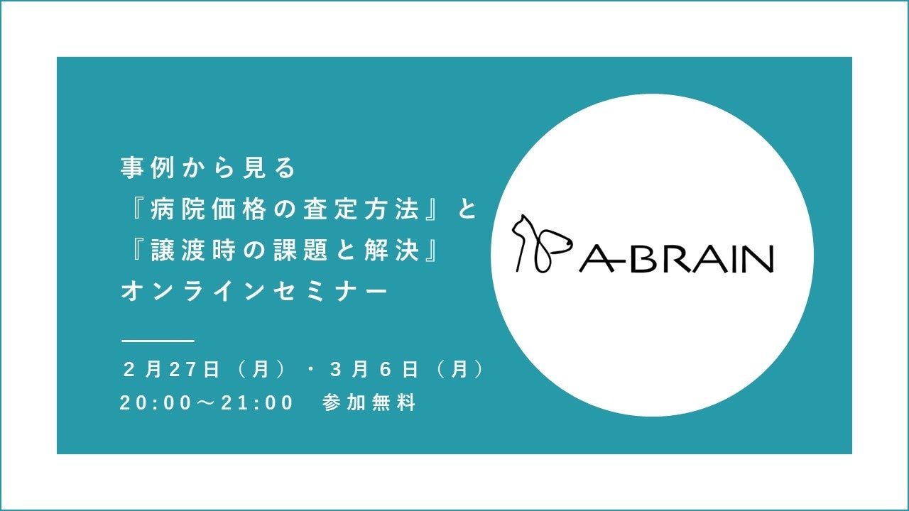 ペットの家族化推進をミッションとし、ペット医療DXをおこなう株式会社TYL(本社:東京都港区 代表取締役:金児 将平、以下TYL)が運営する動物病院の事業承継のサポートをおこなう「A-BRAIN」が、2023年2月27日(月)、3月6日(月)に動物病院向けオンラインセミナー「事例から見る『病院価格の査定方法』と『譲渡時の課題と解決』」を開催いたします。
