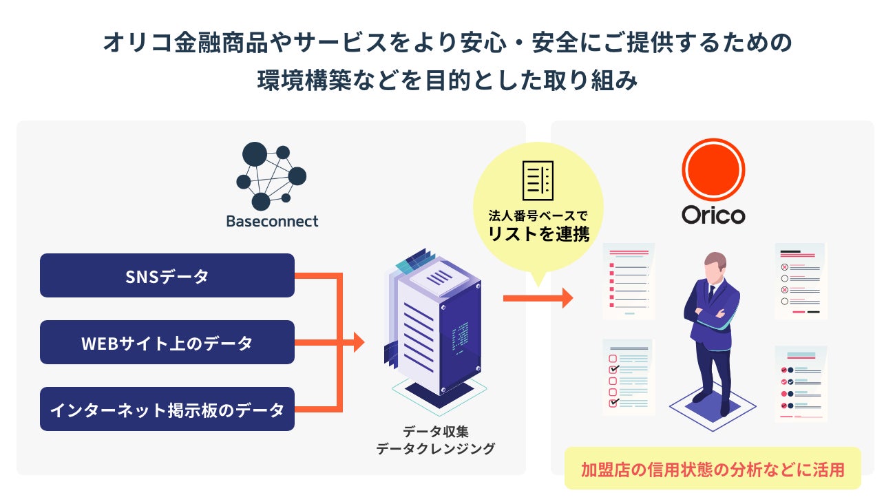 法人営業支援企業情報データベース・次世代型検索エンジンを開発するBaseconnect株式会社(本社:京都府京都市、代表取締役社長:國重侑輝)は、この度株式会社オリエントコーポレーション(東京都千代田区、代表取締役社長:飯盛 徹夫、以下:オリコ)と協業し、オリコの金融商品やサービスをより安心・安全にご提供するための環境構築を目的として、オリコの加盟店に対する調査の効率化・合理化に向けた実証実験を開始いたします。