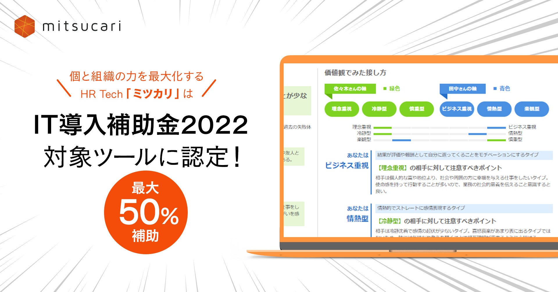 株式会社ミツカリ(本社:東京都渋谷区、代表取締役社長CEO:表 孝憲)は、ひとりひとりの性格や相性を理解・分析して個と組織の力を最大化するHR Tech「ミツカリ」が、経済産業省が推進するサービス等生産性向上IT導入支援事業「IT導入補助金2022」の対象ツールとして認定されたことをお知らせします。ミツカリを導入する中小企業・小規模事業者等は、導入費用の一部について補助金交付を受けることが可能になりました。