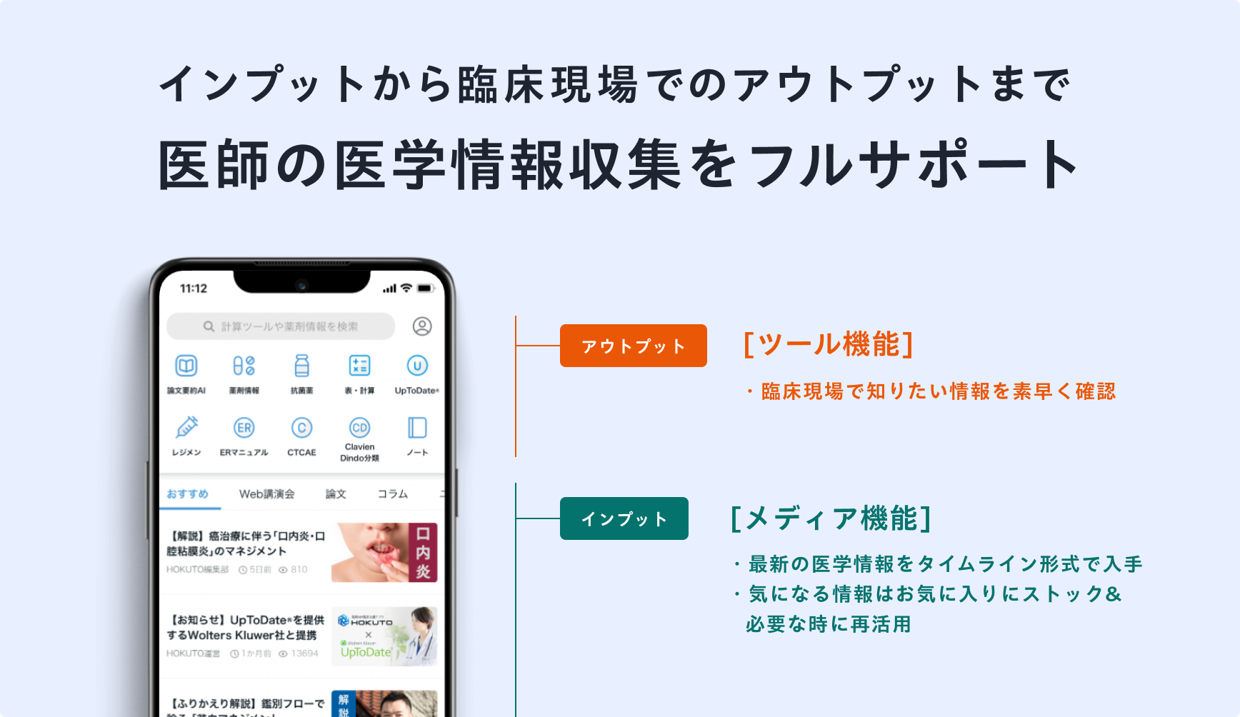 医師向け臨床支援アプリ「HOKUTO」は、医学情報の「インプット」と「アウトプット」を支援する臨床支援アプリです。昨今、医学の進歩によって、医学情報は加速度的なスピードで増加し続けています。医師がより良い医療を実践するためには、最新の医学情報をインプット、それを臨床現場で正確に想起して活用し、さらに必要に応じて改めてリサーチするという行動が求められますが、情報過多によって効率的な情報収集が難しい状況になっています。医師向け臨床支援アプリ「HOKUTO」は、エビデンスに基づいた医学情報への素早いアクセスを可能にすることで、多忙な医師が、膨大な医学情報の中から必要な情報を見つけ出す負担を軽減し、患者さんへのアウトカム(治療や予防による臨床上の成果)の向上に貢献することを目指しています。