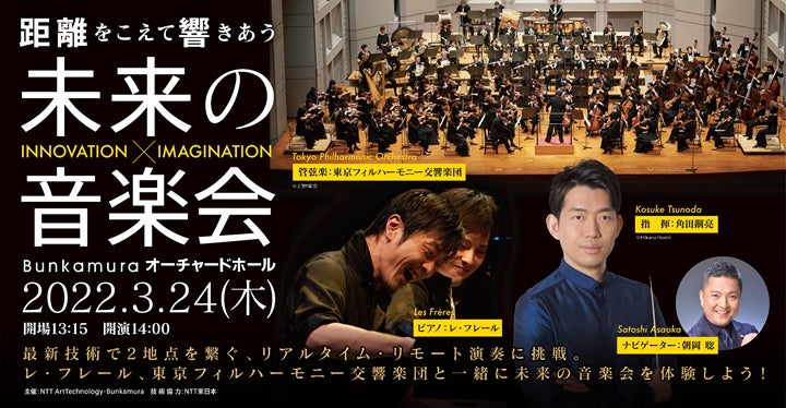 2022年3月24日(木)、BunkamuraオーチャードホールにてNTT ArtTechnologyとBunkamuraが主催するInnovation × Imagination『距離をこえて響きあう 未来の音楽会』を開催します。今回のコンサートでは、NTT東日本の技術協力を得てリアルタイム・リモート演奏に挑戦。渋谷・Bunkamuraオーチャードホールと中継先の西新宿・NTTインターコミュニケーション・センター[ICC]を最新の通信技術で繋ぐ試みです。指揮を務めるのは若手最注目株の一人として活躍の場を拡げている、角田鋼亮。1台4手連弾の「キャトルマンスタイル」で観客をくぎ付けにする唯一無二の兄弟ピアノデュオ、レ・フレールとオーチャードホールフランチャイズオーケストラで国内屈指の名門といわれる東京フィルハーモニー交響楽団が出演します。ナビゲーターに朝岡 聡を迎え、実験的な試みを楽しく解説。新たな挑戦を一緒に見届けていただく皆様を抽選で1,000名様ご招待します。距離をこえて響きあう、未来の音楽会をぜひお楽しみください。