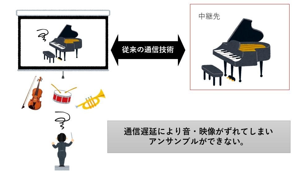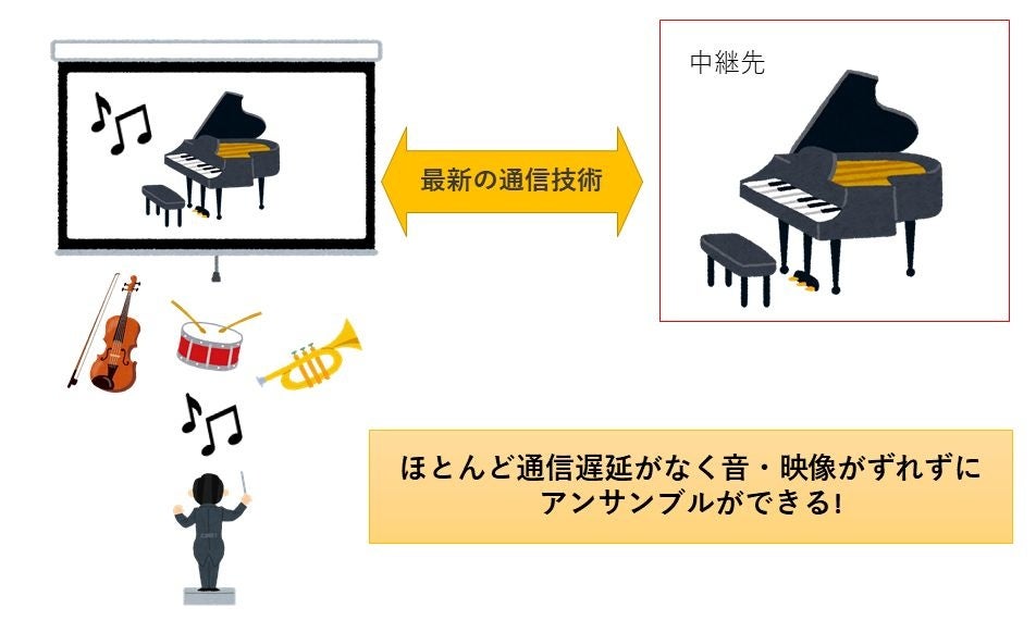 最新の通信技術で会場と中継先の2地点を繋ぎ、ほとんど遅延なく音声と映像を送受信することで、別々の離れた場所にいる演奏者が同時に演奏し、アンサンブルすることを目指します。