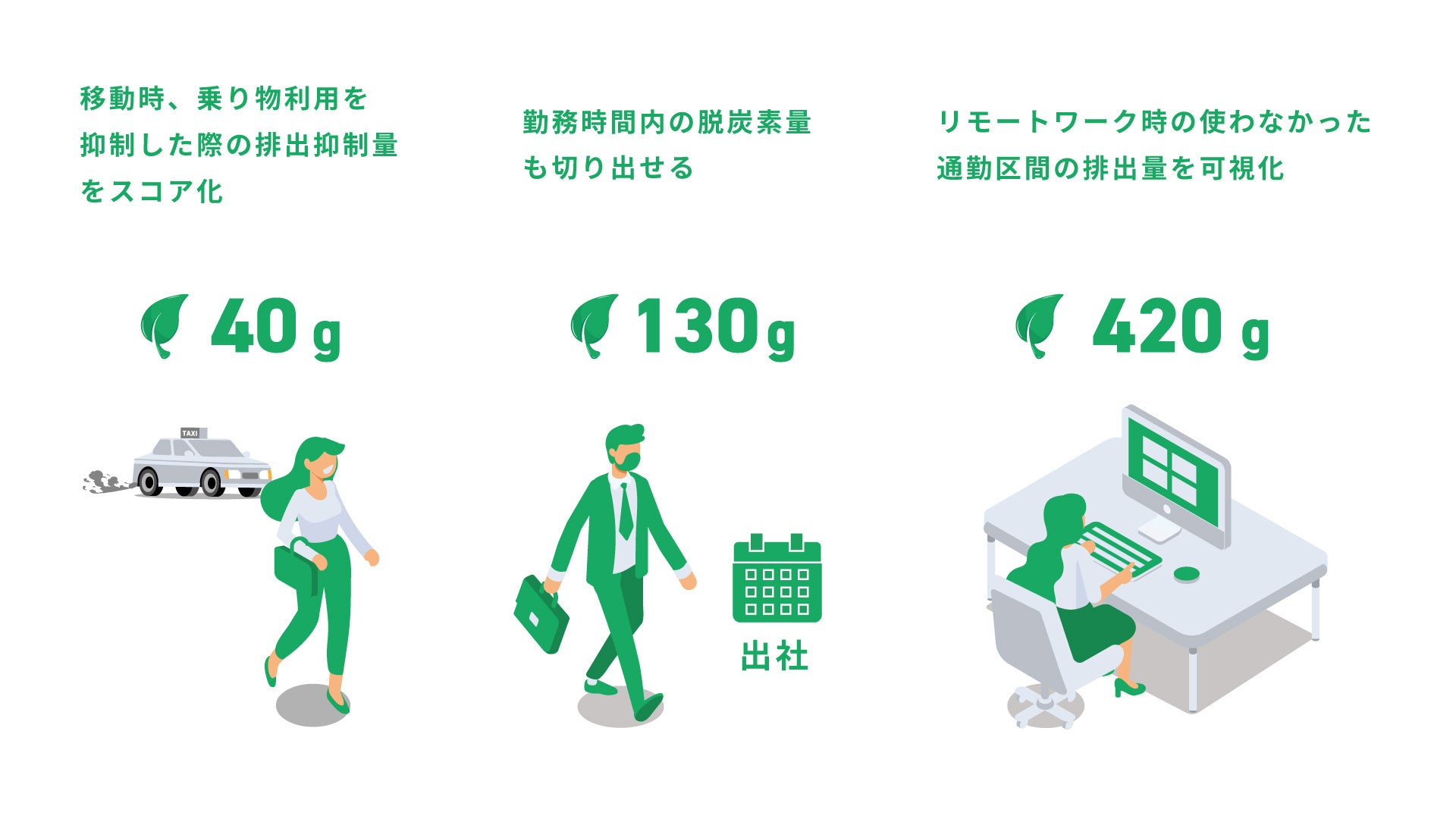 勤務時間の脱炭素量・リモートワーク時の排出抑制量をスコア化し、法人の環境パフォーマンスデータ(スコープ3カテゴリ7)におけるCO2オフセット量の算出を可能とします。