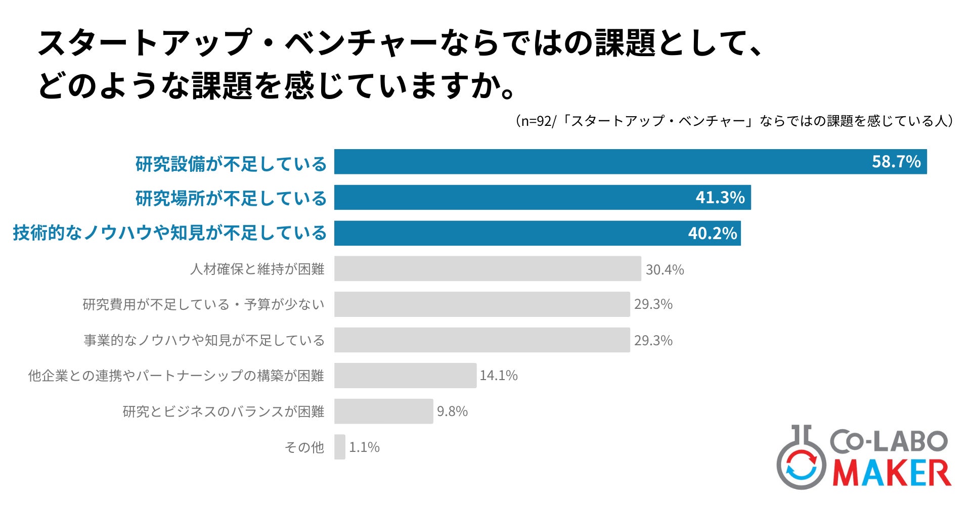 スタートアップ・ベンチャーならではの課題として、どのような課題を感じているか尋ねたところ、「研究設備が不足している」が58.7%で最も多く、「研究場所が不足している」が41.3%、「技術的なノウハウや知見が不足している」が40.2%と続きました(n=92)。
