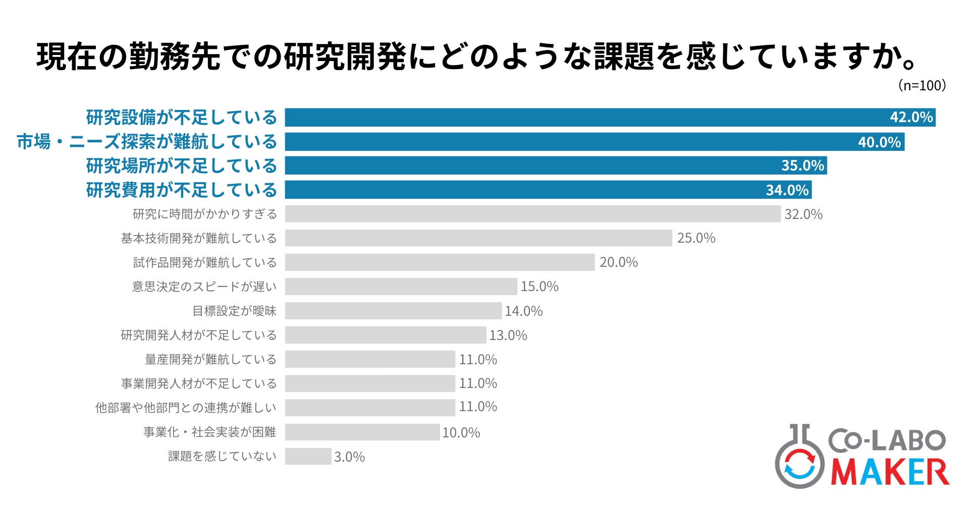 研究開発を加速する研究リソースシェアリングプラットフォームを運営する株式会社Co-LABO MAKER(本社:宮城県仙台市、代表取締役:古谷優貴、以下「当社」)は、ディープテックスタートアップで研究開発に携わっている方を対象に「研究開発現場の実態についてのアンケート」を実施し、100名から回答を得ました。
